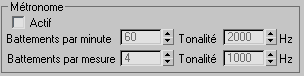 - Cette option permet de définir la fréquence des battements. Les battements apparaissent dans les pistes Métronome sous forme de barres noires verticales. Valeur par défaut : 60.