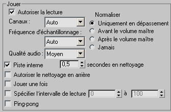 Ces options règlent différents paramètres du son rendu pour l'export. Vous ne pouvez pas les entendre dans 3ds Max à moins d'exporter le son et de le charger à nouveau en tant qu'échantillon. La plupart des options de cette section ont des fonctionnalités similaires aux options du groupe Lire. Les autres options de cette section sont les suivantes :