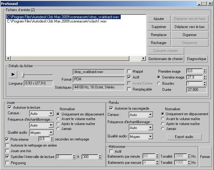 - Indique tous les échantillons chargés avec le chemin des fichiers. Ceux-ci sont automatiquement chargés dans cette scène, démarrent lorsqu'une animation est lancée et sont enregistrés avec les animations rendues. Vous pouvez gérer la lecture de chaque piste avec les commandes du groupe d'options Détails du fichier (voir ce qui suit).