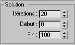 - Spécifie l'intervalle d'images pendant lequel CI est résolu. Si Début est réglé sur 20 et Fin sur 80 dans une animation de 100 images et que l'effecteur d'extrémité est ensuite animé, l'animation de la chaîne ne sera correctement résolue qu'entre Début et Fin.