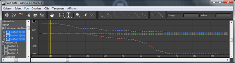 Track View s'ouvre en mode Curve Editor (Editeur de courbe). Seules les pistes animées de l'objet sélectionné sont mises en surbrillance dans la fenêtre Hiérarchie de Vue piste - Editeur de courbes. Il s'agit de l'option par défaut.