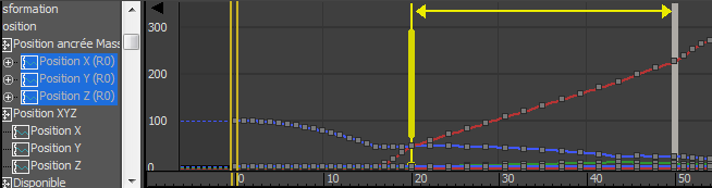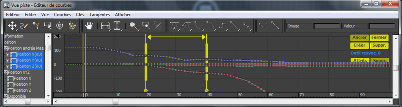 A présent, vous voyez uniquement les clés et les courbes des pistes mises en surbrillance, dont les noms deviennent Position X(R1) et Rotation Y(R1). Cela signifie que les pistes sont sous le contrôle de Resynchronisation 1.