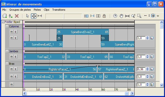 Lors de la création d'un groupe de pistes, une piste de couche lui est affectée par défaut. Cependant, vous pouvez ajouter des pistes supplémentaires à chaque groupe, ce qui rend possible le mixage de mouvements pour chaque ensemble de parties du corps filtrées. Par exemple, vous pouvez créer un groupe de pistes pour les bras et avoir deux pistes de transition dans ce groupe. Vous pouvez ensuite placer deux ensembles de mouvements complètement différents sur chaque piste et utiliser la pondération pour opter pour une piste ou l'autre à différents moments durant le mouvement. Reportez-vous à la rubrique Ajustement du poids d'une piste.