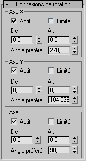 - Définissent les limites des rotations. Utilisez ces options conjointement à la fonction Limité. Cliquez sur les étiquettes De et A pour faire pivoter l'objet en fonction de ses limites. Cette option permet de vérifier les limites de rotation d'un objet.