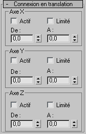 - Définissent les limites des positions. Utilisez ces options conjointement à la fonction Limité. Cliquez sur les étiquettes De et A pour déplacer l'objet en fonction de ses limites. Cette option permet de vérifier les limites de translation d'un objet.