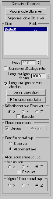 Lorsque vous avez affecté une contrainte Observer, vous pouvez accéder à ses propriétés à partir du panneau déroulant Contrainte Observer du groupe de fonctions Mouvement. Ce panneau déroulant permet d'ajouter ou de supprimer des cibles, d'affecter des poids, d'affecter et animer des valeurs de poids de cible, et d'ajuster d'autres paramètres associés.