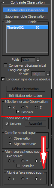 Permet de définir l'axe d'observation de la cible. Les cases à cocher X, Y et Z correspondent au système de coordonnées local de l'objet contraint. La case à cocher Basculer inverse les directions des axes locaux.