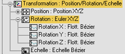 Chaque axe utilise son propre contrôleur indépendant en utilisant le type de données Flottant. Par exemple, les axes de rotation des X et des Y peuvent utiliser des contrôleurs Flott. Bézier, tandis que l'axe de rotation des Z utilise un contrôleur Flott. bruit.