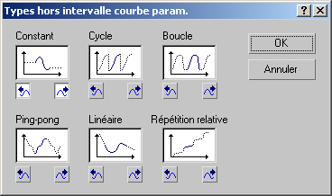 La boîte de dialogue Types hors intervalle courbe param. propose quatre façons de répéter une animation et deux façons d'appliquer des valeurs linéaires.