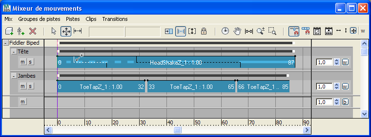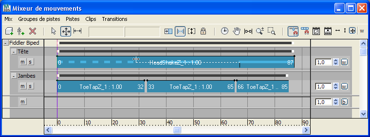 - Ouvrez le mixeur de mouvements, ajoutez un bipède au mixeur, puis chargez un clip sur une piste. Reportez-vous à la rubrique Ajout de pistes dans le mixeur
