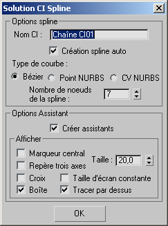 Cette boîte de dialogue permet de définir les paramètres de la spline qui sera créée pour contrôler la structure. La spline est, à son tour, modelée par les positions des objets assistants au niveau de chaque noeud (point de contrôle).