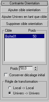 L'utilisation d'un poids n'est utile (et disponible) que dans le cas de cibles multiples. Une valeur de 0 signifie que la cible n'a aucune influence. Toute valeur supérieure à 0 force la cible à influencer l'objet contraint, en fonction des paramètres Poids des autres cibles. Par exemple, une cible ayant une valeur Poids de 80 a deux fois plus d'influence qu'une cible ayant une valeur Poids de 40.
