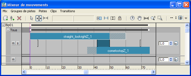 Le mixeur de mouvements vous permet d'étendre une transition à une zone où deux clips ne se chevauchent pas. Cependant, il est probable que cette transition produise des mouvements indésirables dans le mixage.