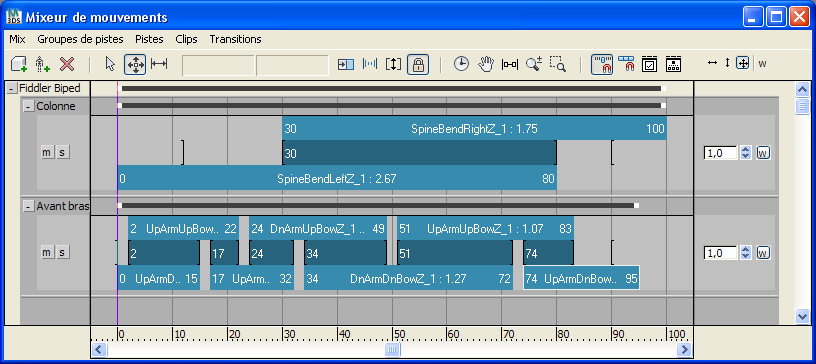 Lorsque des transitions font qu'un pied posé au sol glisse ou saute légèrement ou font qu'une jambe se tend d'une manière anormale, vous pouvez utiliser un mixage complet pour corriger ces problèmes. Reportez-vous à la rubrique Exportation d'une animation vers le bipède.