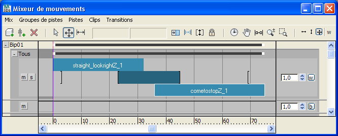 Tout comme pour le mode Séquence, les transitions réalisées dans le mixeur entre des clips basés sur des pas (clips où les contraintes CI maintiennent les pieds au sol à différents moments) doivent être placées et réglées soigneusement pour que l'animation semble aussi naturelle que possible. La méthode à suivre varie selon que vous animez un bipède ou des objets 3ds Max tel un personnage.