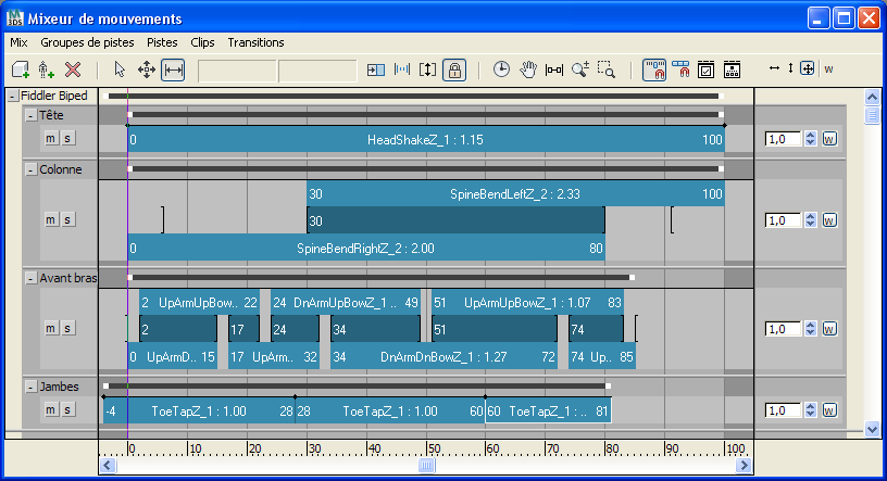 Le mixeur de mouvements fonctionne de la même manière. Pour tout objet, il est possible d'ajouter plusieurs pistes au mixeur, chacune contenant une série distincte de clips de séquence (fichiers BIP ou fichiers XAF) Vous pouvez aussi découper les clips pour n'utiliser qu'une partie d'un mouvement, pour les ralentir ou les accélérer, ou pour créer des transitions d'un clip (ou d'une série de clips) vers un autre.