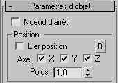 Utilisez les options relatives à des axes déterminés et les options de pondération pour associer chaque liaison à des poids différents et pour identifier l'axe affecté par l'objet de contrôle lié. Utilisez les boutons " Relatif " pour établir un décalage relatif avec Lier position et Lier orientation.