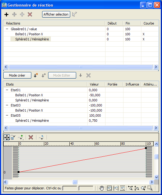 Le gestionnaire de réaction ajoute un nouvel état avec une valeur d'état (glissière) égale à 100.0 et une valeur Hémisphère / Sphère01 égale à 0.750.