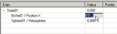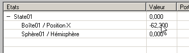 Position X dans le menu contextuel qui apparaît. Dans la liste Réactions, l'entrée de l'esclave Boîte01 / Position X apparaît sous l'entrée correspondant au maître. En outre, un nouvel état correspondant à la nouvelle piste esclave ajoutée apparaît dans la liste Etats. Ceci indique simplement que lorsque la valeur de la glissière est 0, la position X de la boîte correspond à la valeur courante. Cependant, pour qu'elle ait un sens, une réaction nécessite au moins deux états. Vous apprendrez très bientôt comment remédier à ceci.