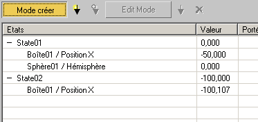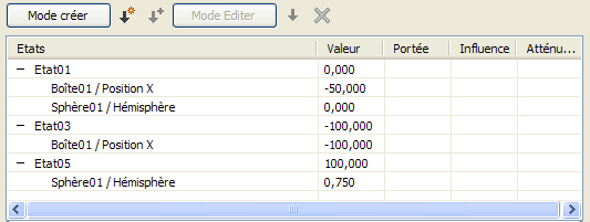 Si vous mettez en surbrillance le nom d'un esclave, vous pouvez modifier sa valeur à l'état courant. Si vous mettez en surbrillance le nom d'un état et cliquez ensuite sur Mode éditer, vous pouvez alors modifier ses pistes esclaves. Pour quitter ce mode et tester de nouvelles valeurs, cliquez de nouveau sur Mode éditer.