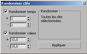 Le décalage aléatoire peut être appliqué aux clés sélectionnées ou à un intervalle de temps sélectionné. Lorsqu'il est appliqué aux clés sélectionnées, le message suivant apparaît : " Toutes les clés sélectionnées ". Lorsque vous l'appliquez à un intervalle de temps en mode Editer temps, cette zone contient le message: " Les clés des pistes sélectionnées sont dans l'intervalle: n à n ".