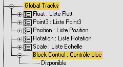 Un contrôleur de bloc est un contrôleur de liste globale qui vous permet de combiner plusieurs pistes à partir d'objets multiples sur une période de temps et de les regrouper sous forme de " blocs ". Ces blocs sont ensuite utilisés pour recréer l'animation à tout moment. Vous pouvez ajouter, supprimer, mettre à l'échelle, déplacer géographiquement et enregistrer des blocs dans la vue piste. Les blocs peuvent représenter une animation absolue ou relative.