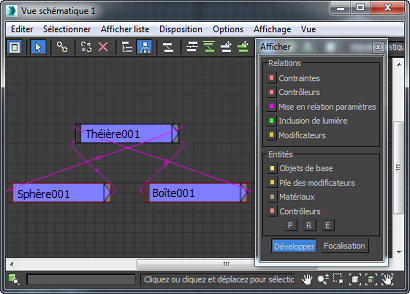 Si des paramètres sont mis en relation au sein d'un noeud de scène (par exemple, la position d'un objet est mise en relation avec le paramètre d'un modificateur appliqué à l'objet), la relation peut ne pas être visible dans la vue schématique. Toutefois, vous pouvez utiliser d'autres options d'affichage afin de rendre ces relations visibles.