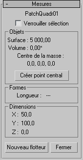 Cette zone de texte affiche le volume total de tous les objets de la sélection, exprimé en unités cubiques. Si des objets comportent des " trous " en raison des faces manquantes, les valeurs de volume peuvent être inexactes. Si un objet comporte un ou plusieurs trous, la valeur du volume est marquée d'un astérisque.