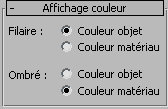 Le panneau déroulant Affichage couleur indique si 3ds Max affiche les objets avec leurs couleurs filaires (couleurs d'objet) ou avec leurs couleurs diffuses de matériau lorsque leurs propriétés d'affichage sont définies sur Par objet.