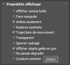 Les trois premières options permettent de réduire la complexité géométrique affichée des objets sélectionnés dans une scène, et améliore ainsi les temps de réponse car l'ordinateur doit effectuer moins de calculs. Ces options sont également disponibles dans la zone Propriétés affichage de la boîte de dialogue Propriétés objet