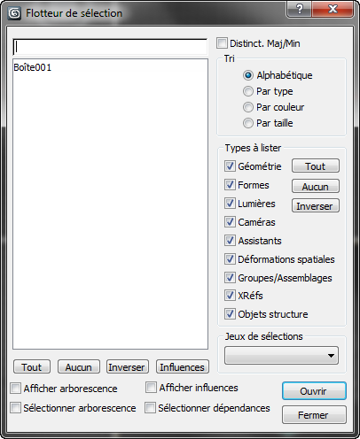 Lorsque cette option est activée et que vous sélectionnez un élément dans la fenêtre de liste, tous les objets dépendants sont également sélectionnés. Les dépendants comprennent les instances, les références et les objets partageant un modificateur commun (les mêmes objets que ceux affichés en vert lorsque l'option Afficher dépendances est activée dans le menu Affichage).