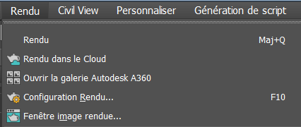 Dans le menu Rendu, la commande Configuration du rendu possède une icône, une ellipse et un raccourci clavier.