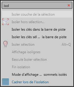 Lorsque vous entrez une chaîne, la boîte de dialogue affiche la liste des actions dont le nom contient le texte que vous avez saisi. Lorsque vous choisissez une action dans cette liste, celle-ci est appliquée (à condition qu'elle soit valide par rapport à l'état courant de la scène), puis la boîte de dialogue disparaît.