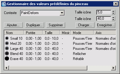 Affiche toutes les valeurs prédéfinies dans une liste déroulante. Chaque entrée de la liste affiche une petite version de l'image du bouton, le nom de la valeur prédéfinie, les plages de force et de taille, les paramètres de Miroir et de Mode et autres paramètres dépendant du contexte.