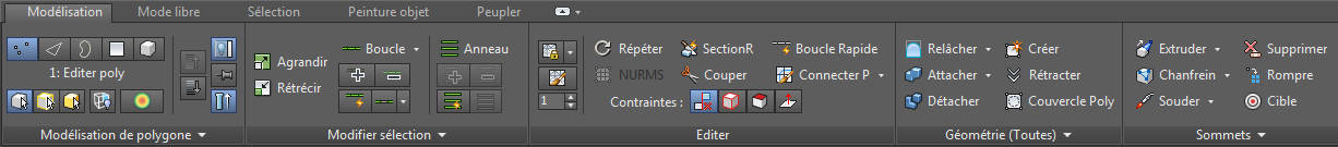 Le premier onglet du ruban est l'onglet Modélisation. Son premier groupe de fonctions, Modélisation de polygone, contient un sous-ensemble d'outils du groupe de fonctions Modifier : niveau de sous-objet (Sommet, Arête, Bordure, Polygone, Elément), niveau de pile, options d'aperçu de la sélection sous-objet, etc. A tout moment, vous pouvez afficher ou masquer chaque groupe de fonctions disponible via son menu contextuel.