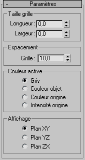 Une zone Afficher figure dans le panneau déroulant Paramètres de chaque objet grille. Elle contient trois options : Plan XY, Plan YZ et Plan ZX. Ces derniers déterminent lequel des trois plans de l'objet grille est affiché dans la fenêtre.