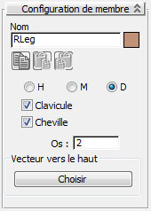 Les membres sont constitués d'une variété de sous-éléments. On y retrouve notamment une clavicule, des os et des paumes. Les principaux paramètres du membre se trouvent dans le panneau déroulant Configuration de membre.