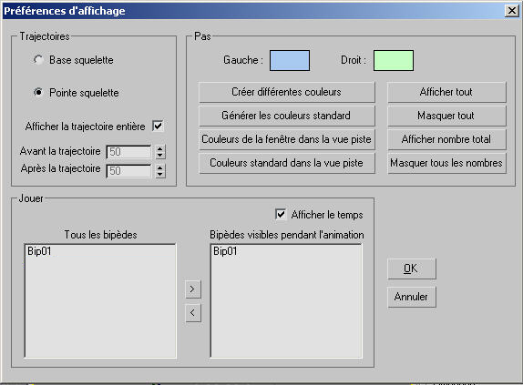 Accédez à la boîte de dialogue Préférences d'affichage pour modifier les couleurs des pas et les paramètres des trajectoires et pour définir le nombre de bipèdes à animer lorsque vous cliquez sur Lire animation bipède dans le panneau déroulant Bipède.