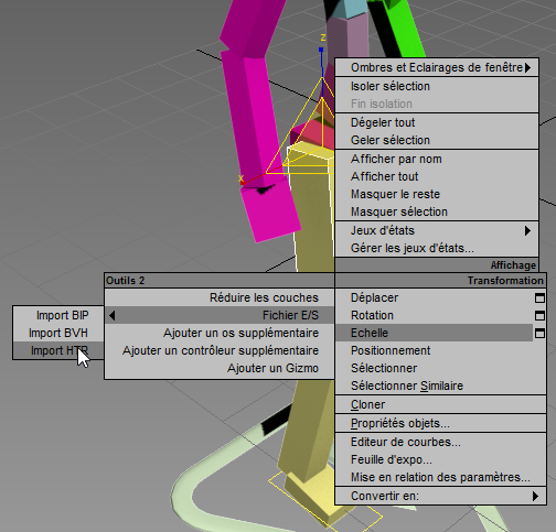 En utilisant la même méthode, vous pouvez importer des fichiers de capture de mouvements HTR et BVH dans CAT. Les programmes d'importation correspondants ouvrent le fichier sous forme d'une hiérarchie de primitives de Boîtes avec des images clés. Vous utilisez l'outil Capturer l'animation pour mapper ce mouvement sur votre Ossature CAT.