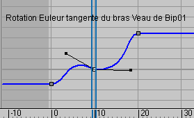 Les tangentes Euler et données TCA quaternioniques sont stockées dans chaque animation. Ainsi, même si vous utilisez le contrôleur Euler XYZ, vous pouvez toujours changer la ligne de profil en long de vos courbes à l'aide des valeurs de contrôle Quaternion/TCA (dans le panneau déroulant des infos clés).