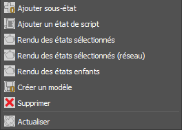 La vue Compositeur comprend deux menus contextuels qui permettent d'assembler rapidement les jeux d'états. Pour plus d'informations sur les options spécifiques, reportez-vous au menu Etats dans la rubrique sur la boîte de dialogue Jeux d'états.