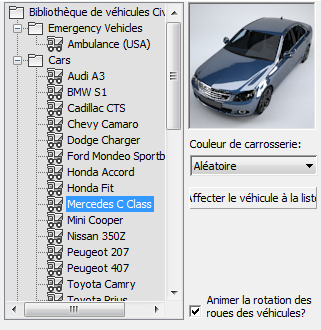 La rotation des roues fonctionne uniquement pour les véhicules présents dans la bibliothèque d'objets qui ont été préparés de façon à répondre à des exigences spécifiques. Pour plus d'informations, reportez-vous à la rubrique Bibliothèque de véhicules.