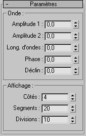 Ces options contrôlent la géométrie du gizmo de déformation Onde. Dans certains cas, elles changent l'effet de l'onde, par exemple lorsque les deux valeurs d'amplitude diffèrent.