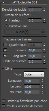 - Lorsqu'un opérateur mParticles Flottabilité est ajouté, une icône d'opérateur est automatiquement insérée dans la scène. Ces paramètres permettent de spécifier la forme de l'icône (rectangulaire ou cylindrique) et en définir les cotes. Vous pouvez modifier les paramètres de l'opérateur dans le panneau de commande en sélectionnant son icône dans la scène.