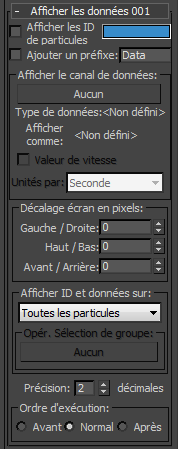Utilisez ces valeurs pour ajuster le positionnement des données de script par rapport à la position des particules, en pixels. En utilisant différentes valeurs de décalage et plusieurs opérateurs Script et Afficher le script, vous pouvez afficher plusieurs données à la fois.
