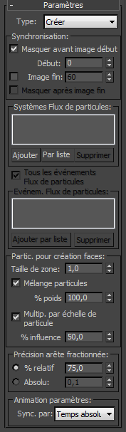 Remarque : Vous pouvez également animer les paramètres Poids, Relatif et Absolu, mais leur animation ne peut pas être synchronisée avec la synchronisation des particules.
