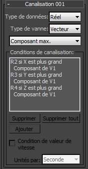 Pour ce qui est de la vanne, les valeurs entrantes V1.x, V1.y, V1.z (composants du vecteur) deviennent les contrôleurs de la vanne. La liste déroulante permet de choisir la façon dont les composants du vecteur sont utilisés pour la canalisation : Composant max., Composant max. absolu, Composant min. ou Composant min. absolu. Avec une vanne de type Vecteur, les boutons Ajouter et Supprimer ne sont pas disponibles, car le nombre de canaux de données d'entrée est fixé à trois ; il en va de même pour une vanne de type Booléen, le nombre de canaux de données d'entrée étant fixé à deux.