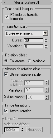 Remarque : vous ne pouvez définir la période de transition qu'en termes de durée. Il n'est pas possible de configurer le test pour qu'il produise une rotation spécifique au moment d'un autre test (test de collision, par exemple). Enfin, le contrôle de l'axe de rotation est limité lorsque la particule arrive à la rotation finale.