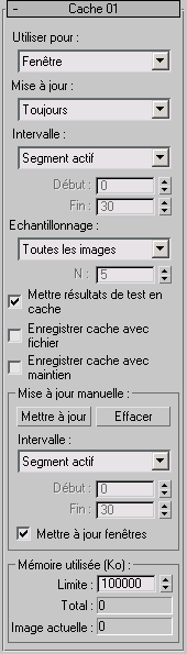 - Permet d'enregistrer en mémoire cache le mouvement des particules lors de la lecture de l'animation dans les fenêtres et/ou lors du rendu. La valeur par défaut est Fenêtre.