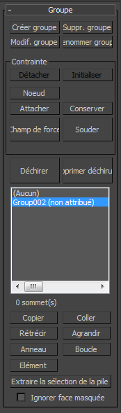 Le panneau déroulant Groupe sert à sélectionner des groupes de sommets et à restreindre leur placement aux surfaces et aux objets collision.